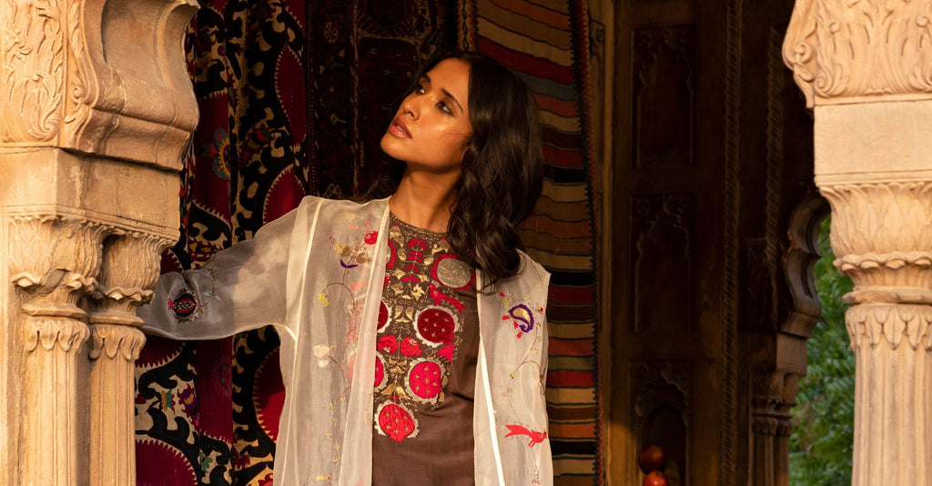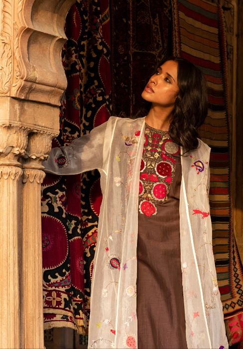 Indian semi-formal women's wear blending handcrafted details with timeless textiles.